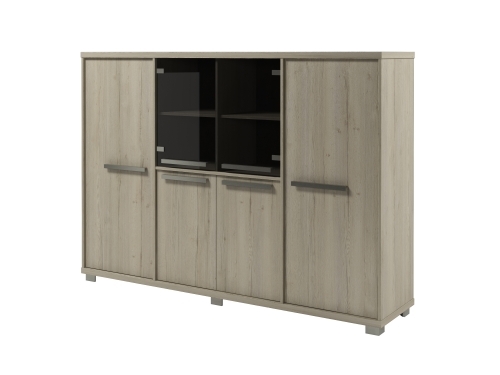 Секции 2, 3, 4 - стеллаж с 4 полками. Две полки с возможностью установки на разную высоту. Две двери глухие. В двух секциях в нижней части двери ЛДСП, сверху стеклянные двери.